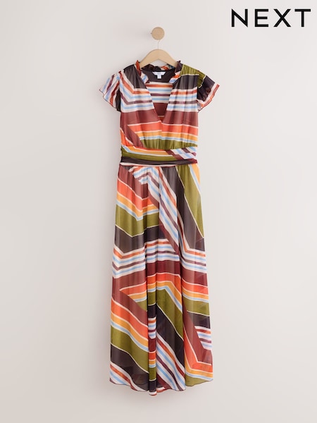 Multi Stripe Print Pleated Mesh Print V-Neck Occasion Maxi Dress