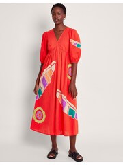 Hard launch your summer wardrobe with this dress. Cast in fiery red, this piece presents bold embroidery over an A-line, midi silhouette. Cut with puff sleeves and a V-neckline, add red mules to take it into the evening. As part of the journey to make our clothes kinder to the world around us, this item was made using more sustainable raw materials, such as organic cotton, recycled polyester and viscose from responsibly grown forests. Machine washable. 100% Cotton. Country of Origin: Great Britain