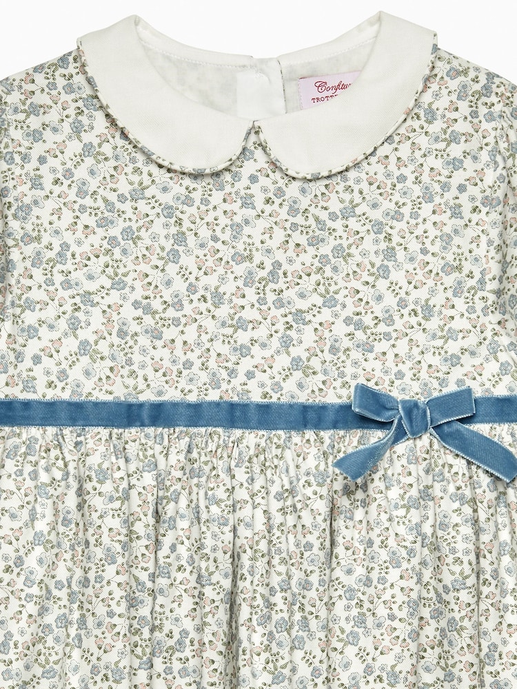 Our Aubrey dress is made from 100% cotton and showcases a beautiful miniature floral print in tones of blue and pink. Complete with long sleeves, a white Peter Pan collar with smart matching floral piping and a tonal blue velvet bow, this would make a chic addition to any girl's wardrobe. Machine washable. Main 100% Cotton. Lining 100% Cotton. Country of Origin: Portugal