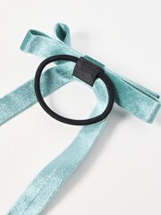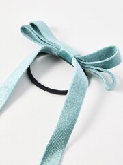 Black hair band with a blue velvet bow. 100% Polyester. Country of Origin: Great Britain